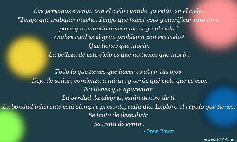 Las personas sueñan con el cielo cuando ya están en el cielo: “Tengo que trabajar mucho. Tengo que hacer esto y sacrificar esto otro, para que cuando muera me vaya al cielo.” ¿Sabes cuál es el gran problema con ese cielo? Que tienes que morir. La belleza de este cielo es que no tienes que morir. Todo lo que tienes que hacer es abrir tus ojos. Deja de soñar, comienza a mirar, y verás qué cielo que es este. No tienes que aparentar. La verdad, la alegría, están dentro de ti. La bondad inherente está siempre presente, cada día. Explora el regalo que tienes. Se trata de descubrir. Se trata de sentir.