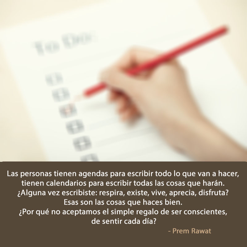 Las personas tienen agendas para escribir todo lo que van a hacer, tienen calendarios para escribir todas las cosas que harán. ¿Alguna vez escribiste: respira, existe, vive, aprecia, disfruta? Esas son las cosas que haces bien. ¿Por qué no aceptamos el simple regalo de ser conscientes, de sentir cada día?