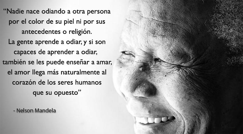 “Nadie nace odiando a otra persona por el color de su piel ni por sus antecedentes o religión. La gente aprende a odiar, y si son capaces de aprender a odiar, también se les puede enseñar a amar, el amor llega más naturalmente al corazón de los seres humanos que su opuesto”
