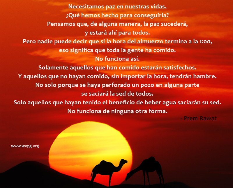 Necesitamos paz en nuestras vidas. ¿Qué hemos hecho para conseguirla? Pensamos que, de alguna manera, la paz sucederá, y estará ahí para todos. Pero nadie puede decir que si la hora del almuerzo termina a la 1:00, eso significa que toda la gente ha comido. No funciona así. Solamente aquellos que han comido estarán satisfechos. Y aquellos que no hayan comido, sin importar la hora, tendrán hambre. No solo porque se haya perforado un pozo en alguna parte se saciará la sed de todos. Solo aquellos que hayan tenido el beneficio de beber agua saciarán su sed. No funciona de ninguna otra forma. Es una experiencia personal.