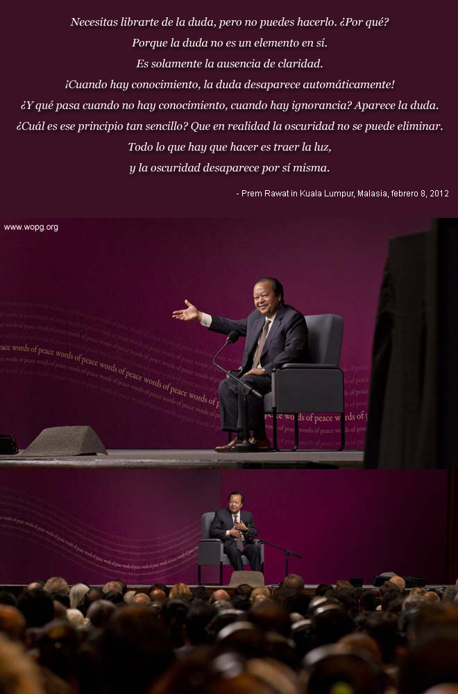 Necesitas librarte de la duda, pero no puedes hacerlo. ¿Por qué? Porque la duda no es un elemento en sí. Es solamente la ausencia de claridad. ¡Cuando hay conocimiento, la duda desaparece automáticamente! ¿Y qué pasa cuando no hay conocimiento, cuando hay ignorancia? Aparece la duda. ¿Cuál es ese principio tan sencillo? Que en realidad la oscuridad no se quita. Todo lo que hay que hacer es traer la luz, y la oscuridad desaparece por sí misma.