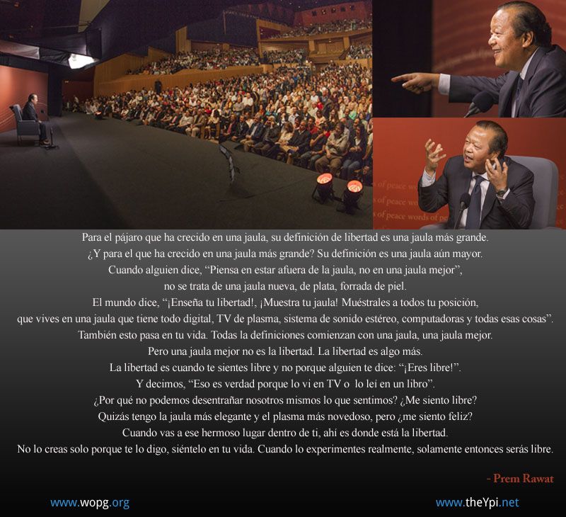 Para el pájaro que ha crecido en una jaula, su definición de libertad es una jaula más grande. ¿Y para el que ha crecido en una jaula más grande? Su definición es una jaula aún mayor. Cuando alguien dice, “Piensa en estar afuera de la jaula, no en una jaula mejor”, No se trata de una jaula nueva, de plata, forrada de piel. El mundo dice, “¡Enseña tu libertad!, ¡Muestra tu jaula! Muéstrales a todos tu posición, que vives en una jaula que tiene todo digital, TV de plasma, sistema de sonido estéreo, computadoras y todas esas cosas.” También esto pasa en tu vida. Todas la definiciones comienzan con una jaula, una jaula mejor. Pero una jaula mejor no es la libertad. La libertad es algo más. La libertad es cuando te sientes libre y no porque alguien te dice: “¡Eres libre!”. Y decimos, “Eso es verdad porque lo vi en TV, o lo leí en un libro.” ¿Por qué no podemos desentrañar nosotros mismos lo que sentimos? ¿Me siento libre? Quizás tengo la jaula más elegante y el plasma más novedoso, pero ¿me siento feliz? Cuando vas a ese hermoso lugar dentro de ti, ahí es donde está la libertad. No lo creas solo porque te lo digo, siéntelo en tu vida. Cuando lo experimentes realmente, solamente entonces serás libre.