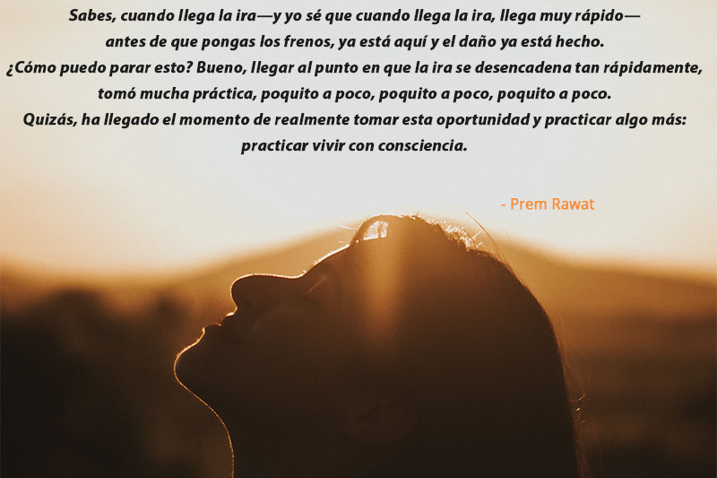 Sabes, cuando llega la ira—y yo sé que cuando llega la ira, llega muy rápido-- antes de que pongas los frenos, ya está aquí y el daño ya está hecho. ¿Cómo puedo parar esto? Bueno, llegar al punto en que la ira se desencadena tan rápidamente, tomó mucha práctica, poquito a poco, poquito a poco, poquito a poco. Quizás, ha llegado el momento de realmente tomar esta oportunidad y practicar algo más: practicar vivir con consciencia. .