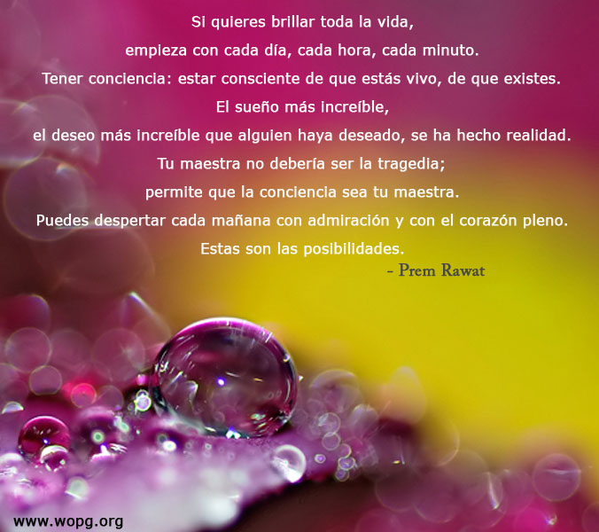 Si quieres brillar toda la vida, empieza con cada día, cada hora, cada minuto. Tener conciencia: estar consciente de que estás vivo, de que existes. El sueño más increíble, el deseo más increíble que alguien haya deseado, se ha hecho realidad. Tu maestra no debería ser la tragedia. Permite que la conciencia sea tu maestra. Puedes despertar cada mañana con admiración y con el corazón pleno. Estas son las posibilidades.