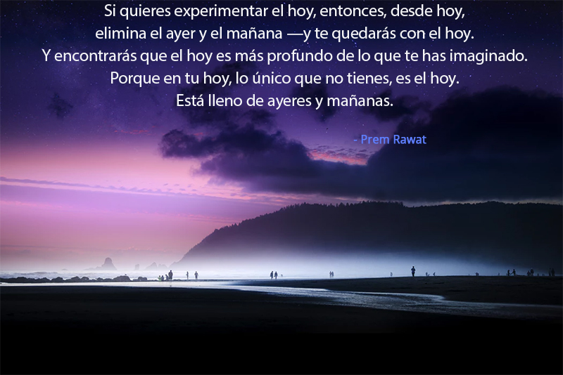 Si quieres experimentar el hoy, entonces, desde hoy, elimina el ayer y el mañana —y te quedarás con el hoy. Y encontrarás que el hoy es más profundo de lo que te has imaginado. Porque en tu hoy, lo único que no tienes, es el hoy. Está lleno de ayeres y mañanas.