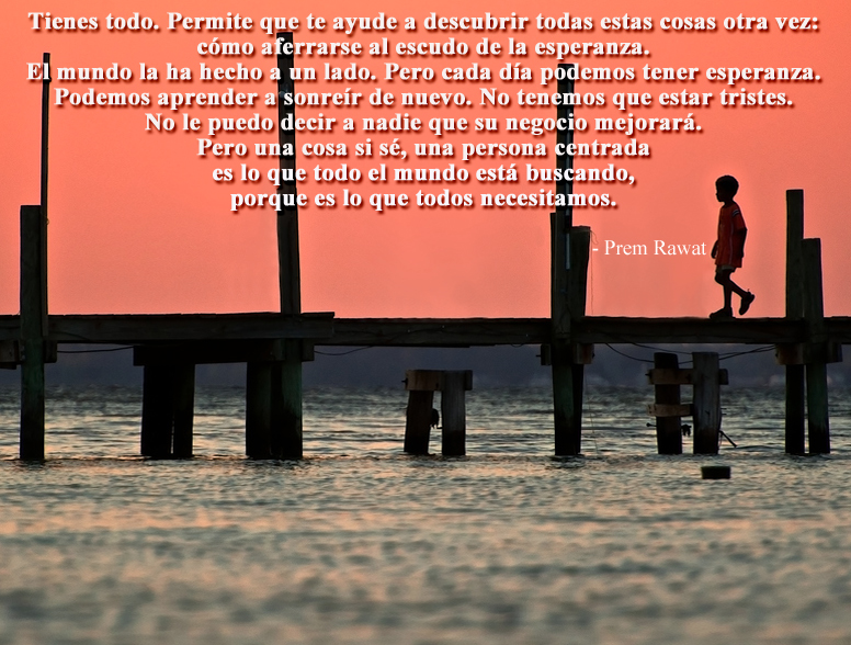 Tienes todo. Permite que te ayude a descubrir todas estas cosas otra vez: cómo aferrarse al escudo de la esperanza. El mundo la ha hecho a un lado. Pero cada día podemos tener esperanza. Podemos aprender a sonreír de nuevo. No tenemos que estar tristes. No le puedo decir a nadie que su negocio mejorará. Pero una cosa si sé, una persona centrada es lo que todo el mundo está buscando, porque es lo que todos necesitamos.