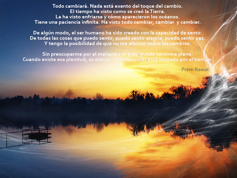 Todo cambiará. Nada está exento del toque del cambio. El tiempo ha visto como se creó la Tierra. La ha visto enfriarse y cómo aparecieron los océanos. Tiene una paciencia infinita. Ha visto todo cambiar, cambiar y cambiar. De algún modo, el ser humano ha sido creado con la capacidad de sentir. De todas las cosas que puedo sentir, puedo sentir alegría; puedo sentir paz. Y tengo la posibilidad de que no me afecten todos los cambios. Sin preocuparme por el mañana o el ayer, puedo sentirme pleno. Cuando existe esa plenitud, es eterna. Todo lo demás está limitado por el tiempo.