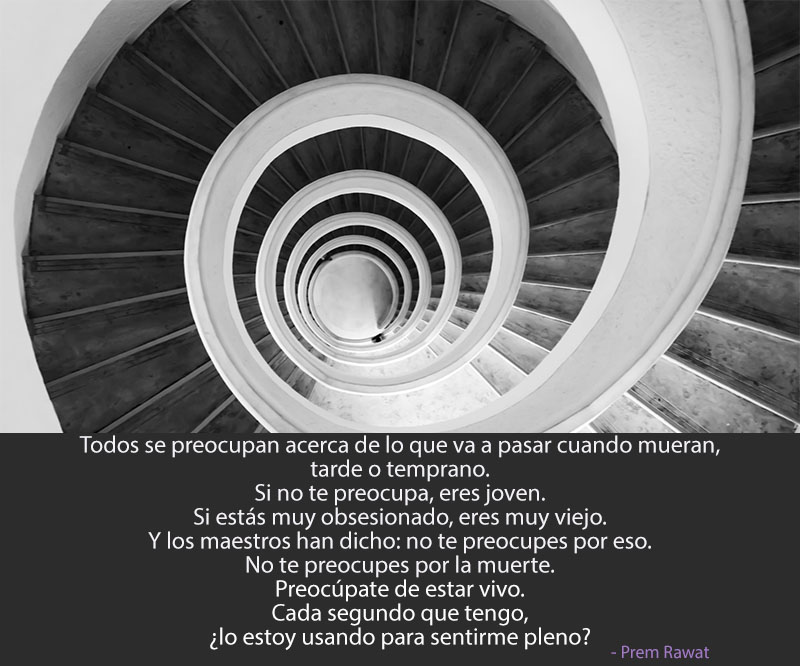 Todos se preocupan acerca de lo que va a pasar cuando mueran, tarde o temprano. Si no te preocupa, eres joven. Si estás muy obsesionado, eres muy viejo. Y los maestros han dicho: no te preocupes por eso. No te preocupes por la muerte. Preocúpate de estar vivo. Cada segundo que tengo, ¿lo estoy usando para sentirme pleno?