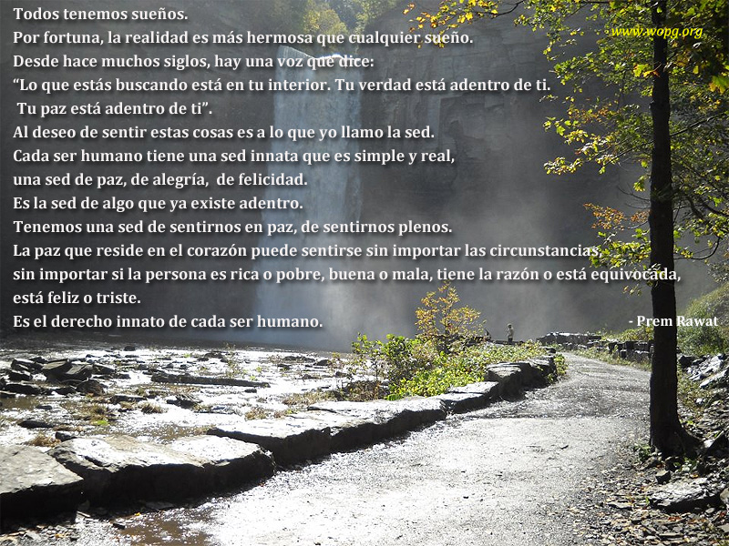 Todos tenemos sueños. Por fortuna, la realidad es más hermosa que cualquier sueño. Desde hace muchos siglos, hay una voz que dice: “Lo que estás buscando está en tu interior. Tu verdad está adentro de ti. Tu paz está adentro de ti”. Al deseo de sentir estas cosas es a lo que yo llamo la sed. Cada ser humano tiene una sed innata que es simple y real, una sed de paz, de alegría, de felicidad. Es la sed de algo que ya existe adentro. Tenemos una sed de sentirnos en paz, de sentirnos plenos. La paz que reside en el corazón puede sentirse sin importar las circunstancias, sin importar si la persona es rica o pobre, buena o mala, tiene la razón o está equivocada, está feliz o triste. Es el derecho innato de cada ser humano.